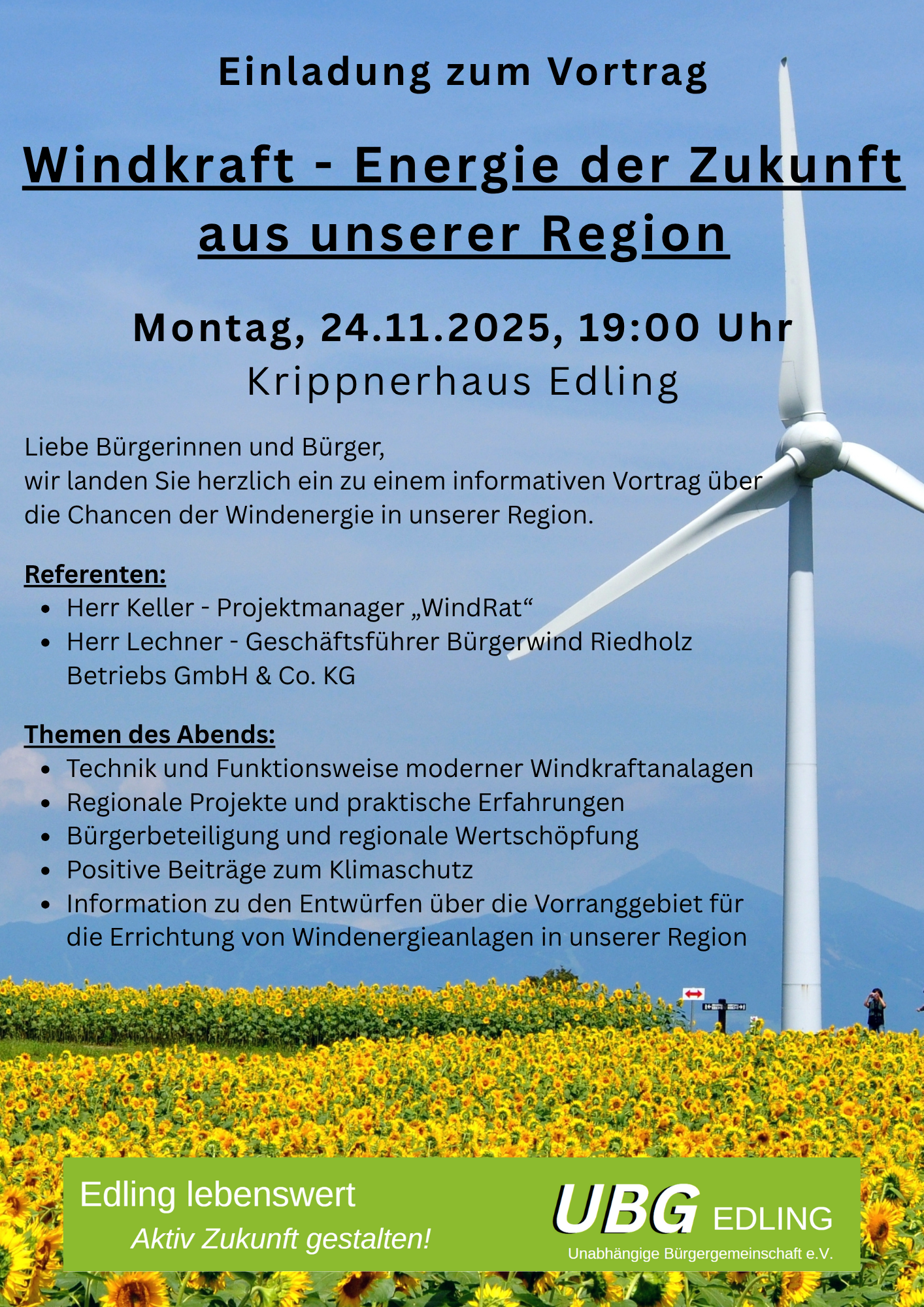 Am 24. November um 19 Uhr lädt die Unabhängige Bürgergemeinschaft Edling (UBG) alle Bürger*innen herzlich zu einem spannenden Informationsabend über die Chancen der Windenergie in das Krippnerhaus in Edling ein.